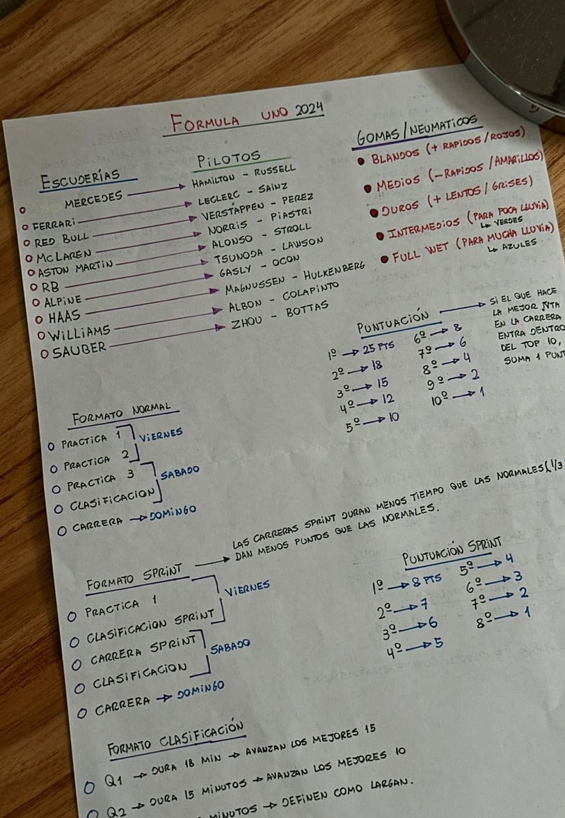 El usuario @TomiConcina compartió en la red social “X” un manual con las principales reglas y partícipes de la Fórmula 1, con la siguiente leyenda: “Me dio ternura mi novia intentando aprender de F1 así que le hice esto para que pueda entender lo básico. Tenes un muy buen novio, @flor_biasone”.